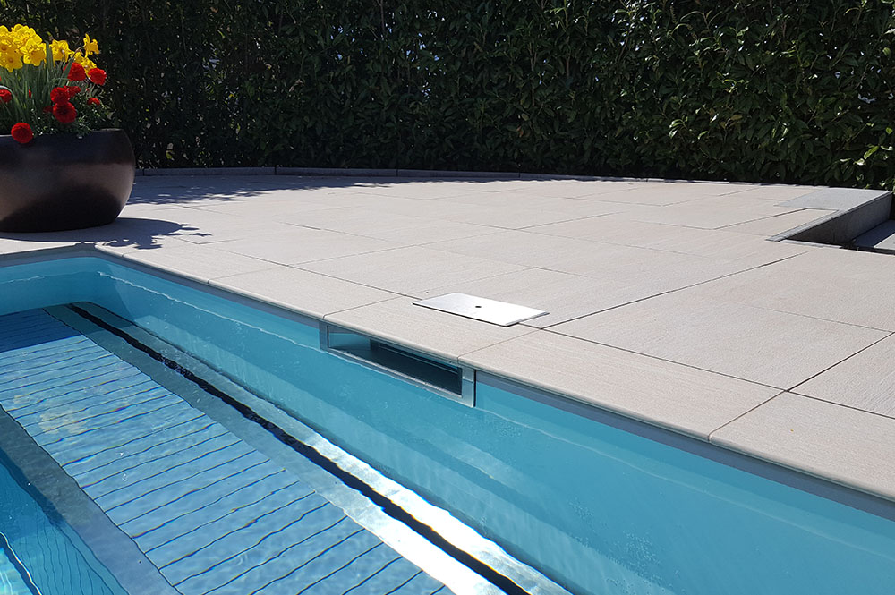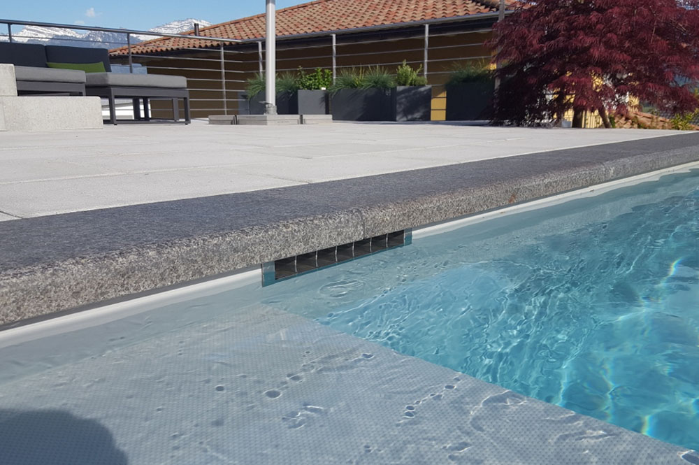 Bei einem Skimmerbecken wird das Wasser über eine Ansaugöffnung in der Beckenwand in eine Filteranlage geleitet. Aus diesem Grund ist der Wasserspiegel immer unterhalb der Beckenumrandung.