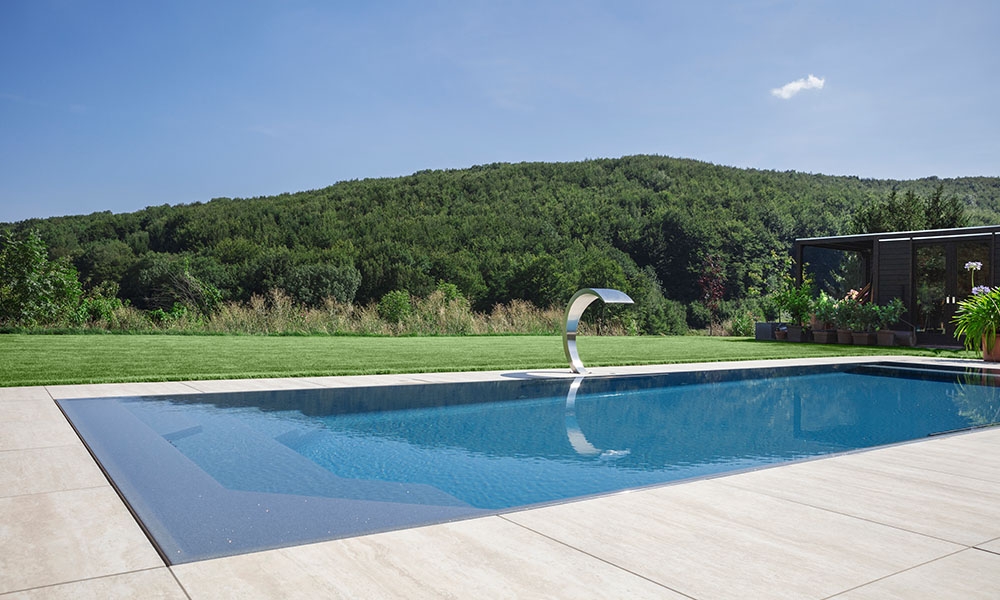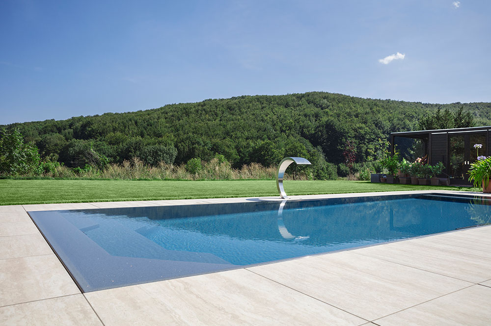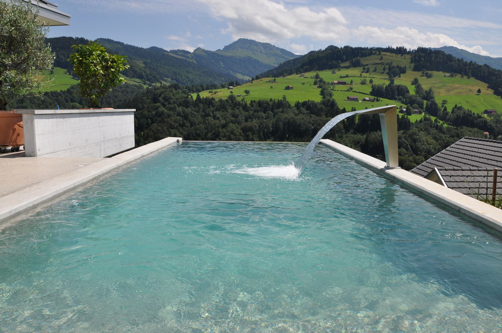 Durch das System mit Überlaufrinne spannt sich der Wasserspiegel ebenflächig, so schwimmen Sie auf höchstem Niveau mit freier Sicht über den Beckenrand.