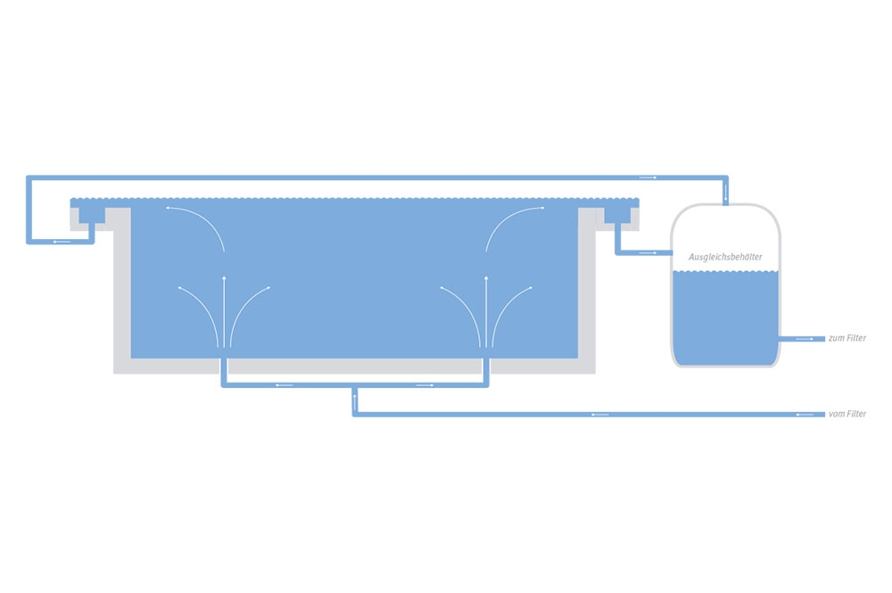 Bei einem Schwimmbad mit Überlaufrinne wird das Becken ständig überflutet. Das Wasser läuft über Rinne, Rinnenabläufe und Sammelleitung in einen Ausgleichsbehälter und wird danach zur Filteranlage geleitet. Das sorgt für eine optimale Reinigung der Wasseroberfläche und für ein ungetrübtes Badevergnügen.